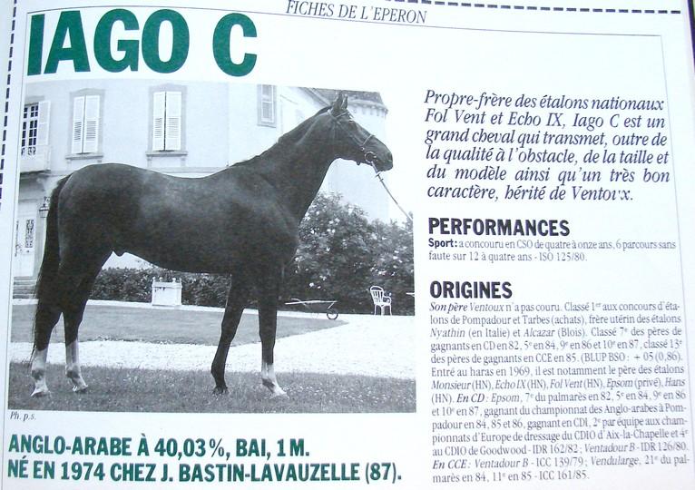 Sa mère Bergère du Chateau, fille de Iago C et Rose du Chateau par Fol Avril a fait naître, Fango, Gold et Love iN Blue qui tourne actuellement avec une cavalière vétéran et que l'on a pu voir cette année au Salon du Cheval.